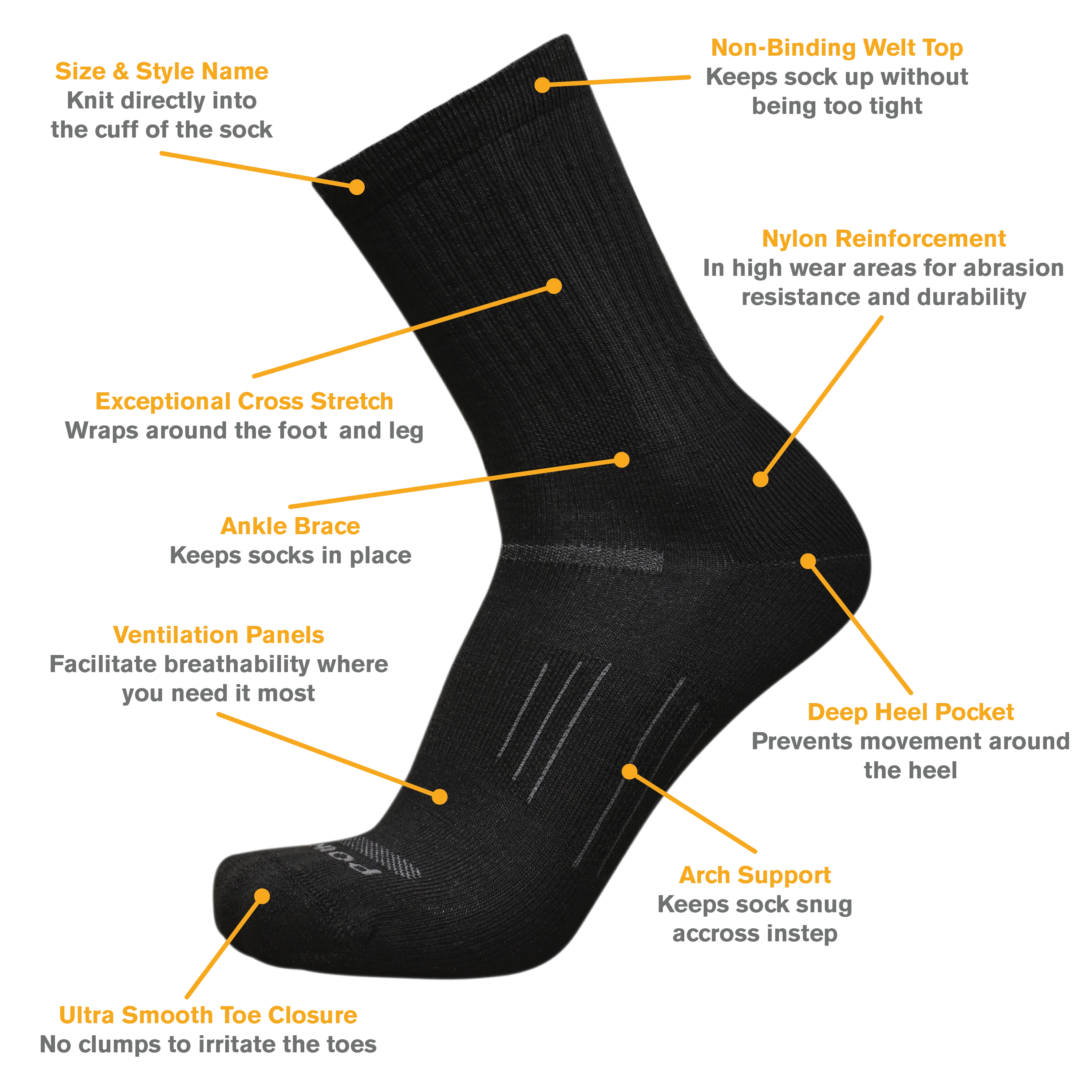 These performance extra light cushion 3/4 crew socks are the right choice for a day on the trails or riding to work. Extra Light cushion provides a little bit of cushion but not much extra volume while Sport Support technology provides whole-foot support that hugs the foot without being constrictive.