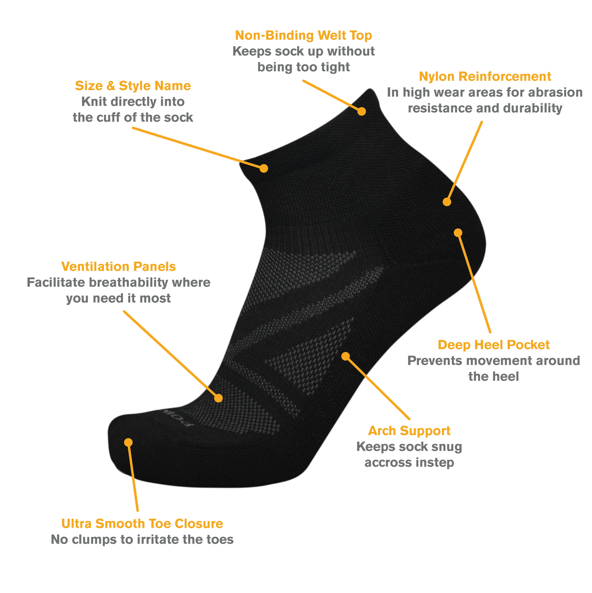 Get your second wind in these performance ultra light cushion 1/4 crew socks (with a 2 1/2" cuff). Featuring Sport Support technology with whole-foot support that hugs the foot without being constrictive and enhanced mesh zones that improve breathability. This ultra light low profile and low volume sock is the perfect choice for running, cycling, and more.