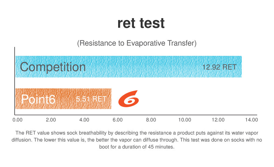 We had 3rd party ‘Inside Climate’ put our socks to the test against a competitor, and the results were overwhelming. Point6 wins in breathability, thermoregulation and evaporation speed.
