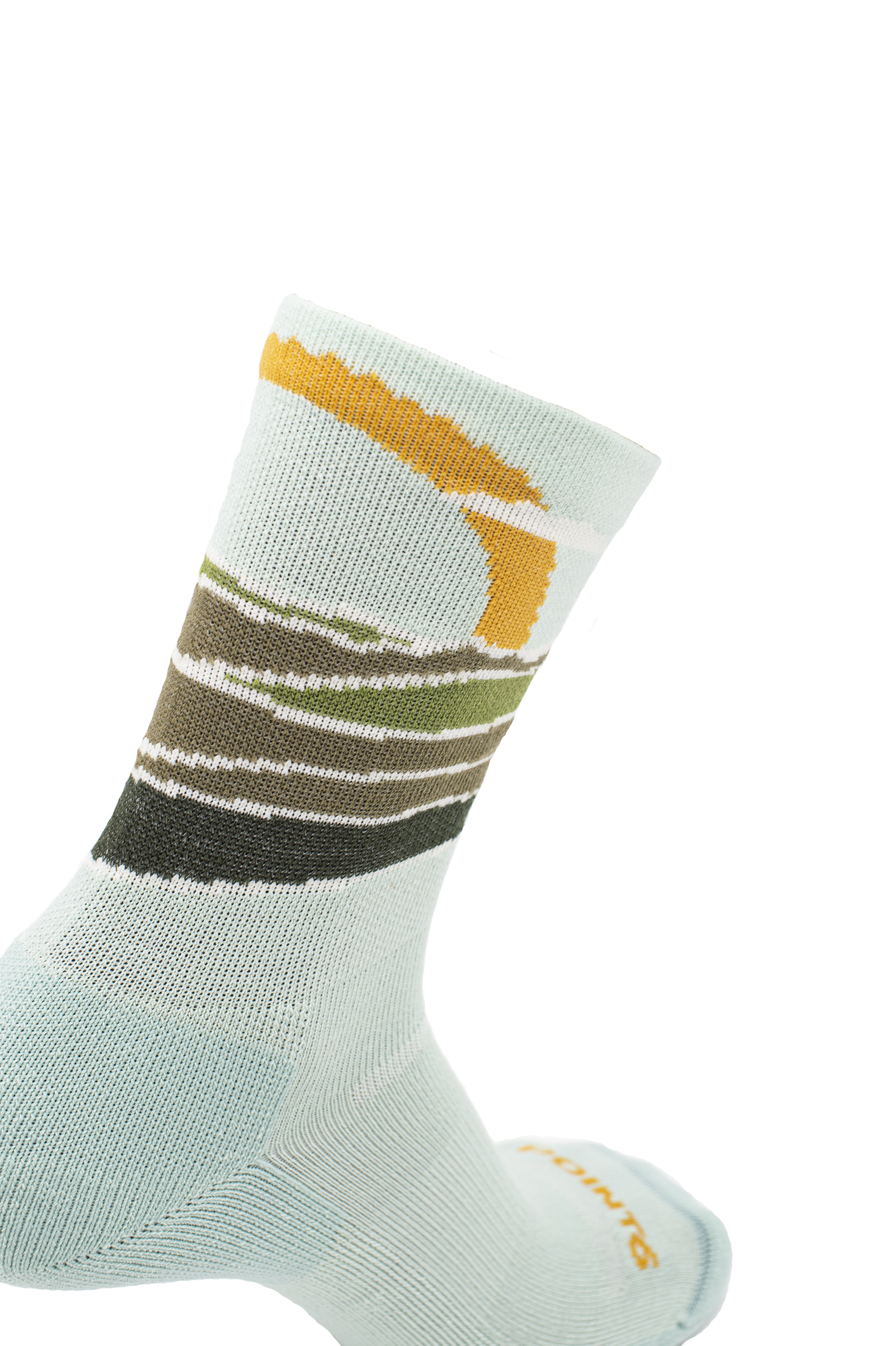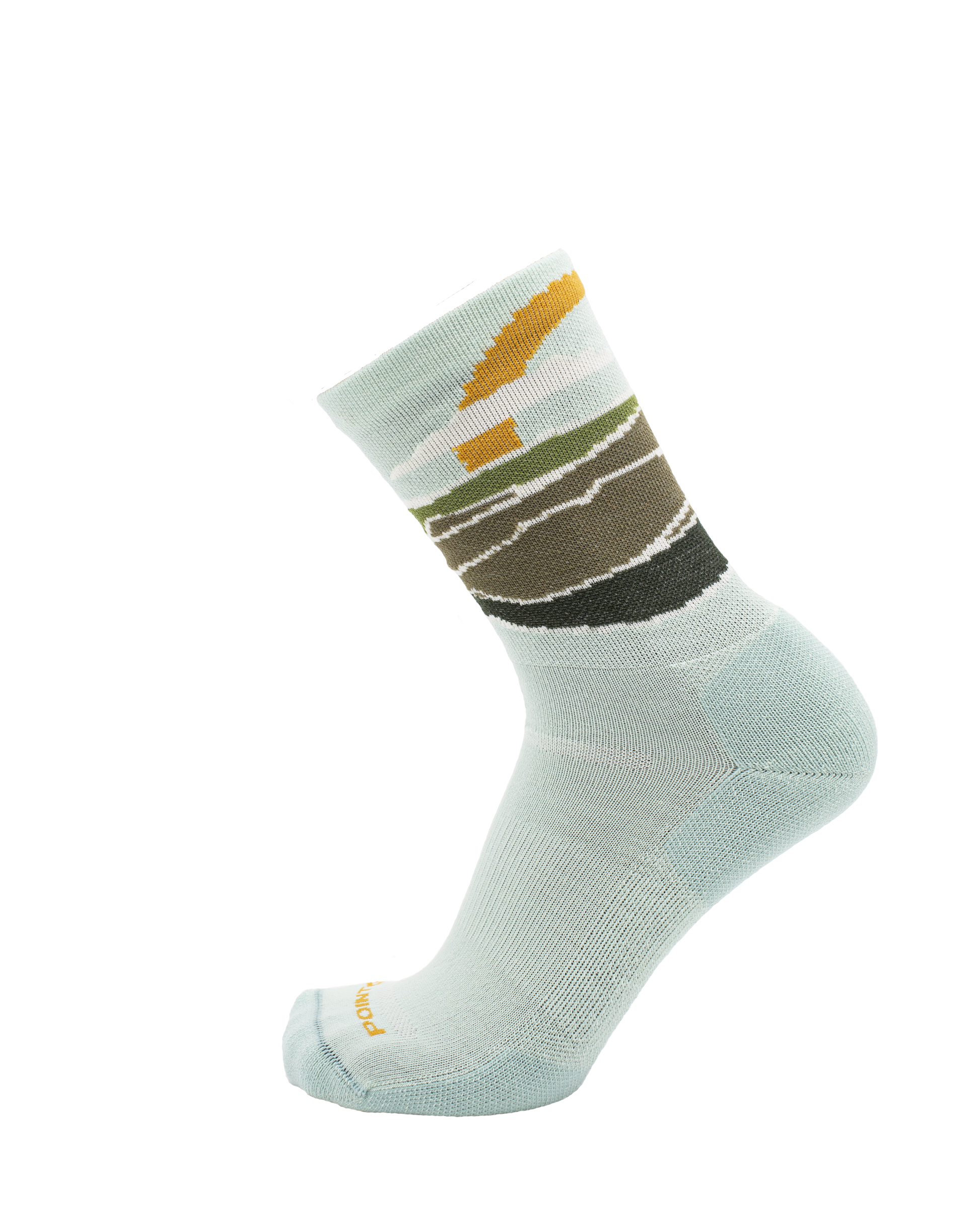 We worked with Ohana in Steamboat to create this limited run of socks that showcase the geography around Routt County. The landscape is reflective of the views while on top of Rabbit Ears Pass, while the bike tire sun hearkens to the core of what Routt County Riders is all about.